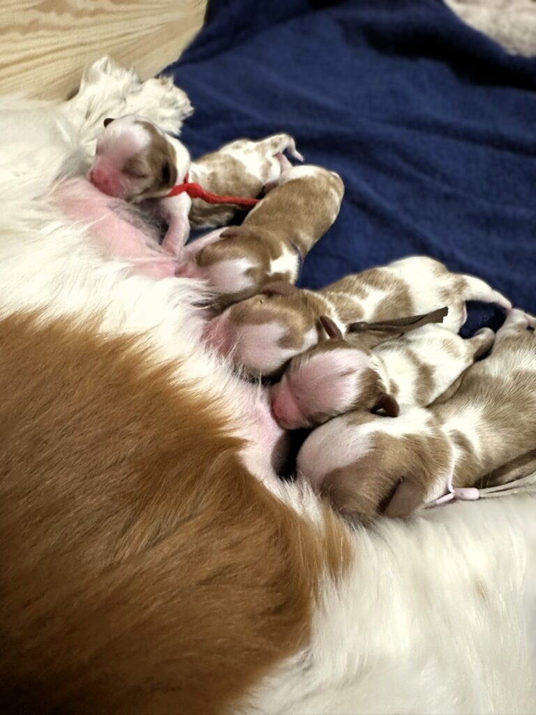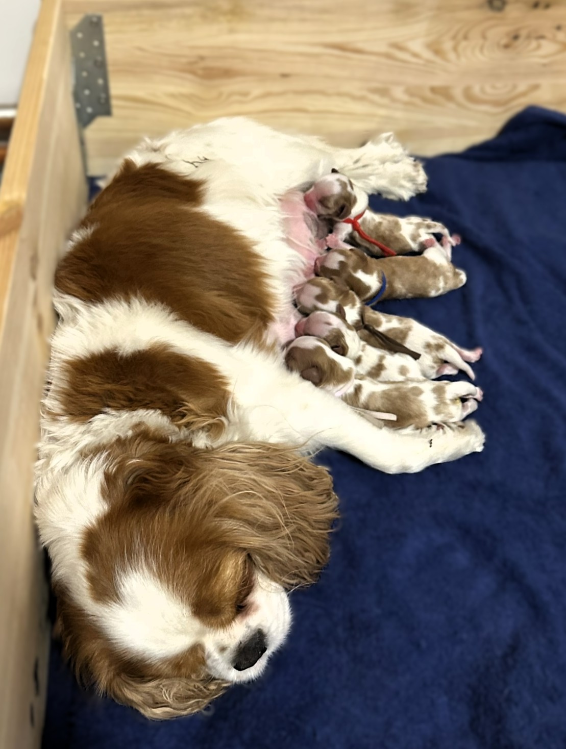 Všechna štěňátka se narodila v čisté a zářivé barvě blenheim, kterou zdědila po svých skvělých rodičích.